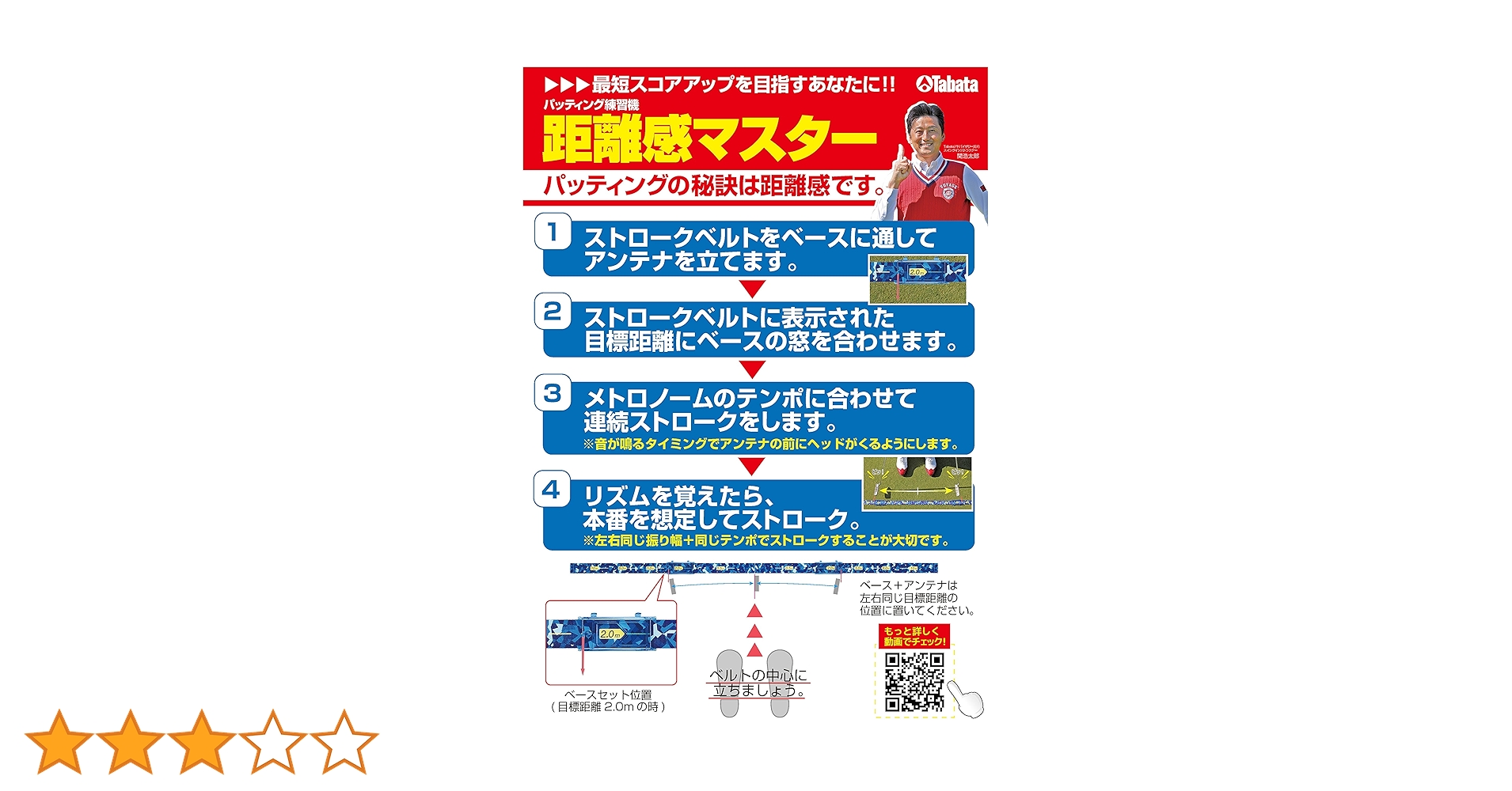 『距離感マスター』は、振り幅の目安が書かれた専用のベルトを床に敷いて、同梱のメトロノームのテンポに合わせてベルトの振り幅を見ながらパッティングすることで、一定の距離における振り幅とテンポを覚える練習器具です。